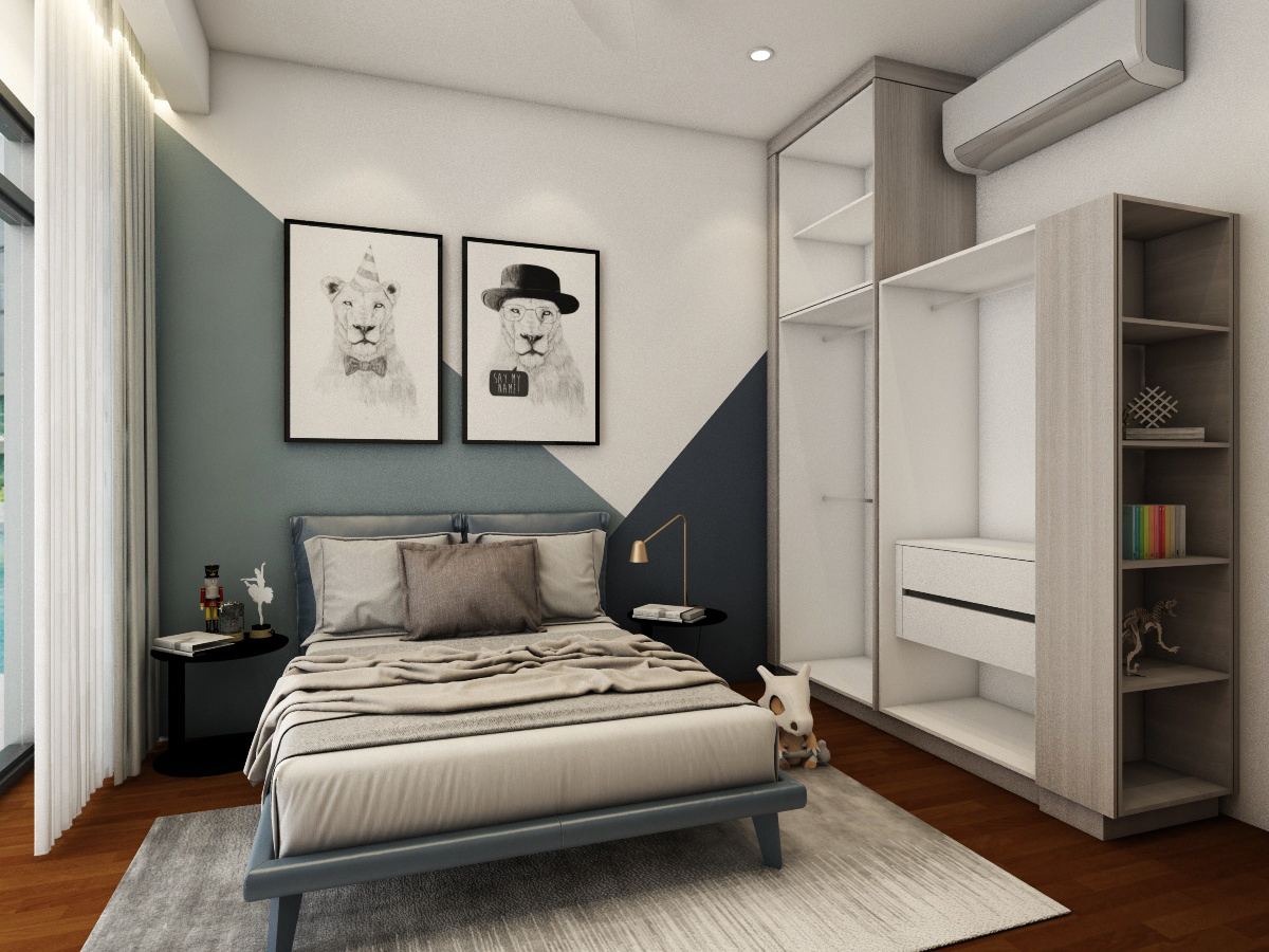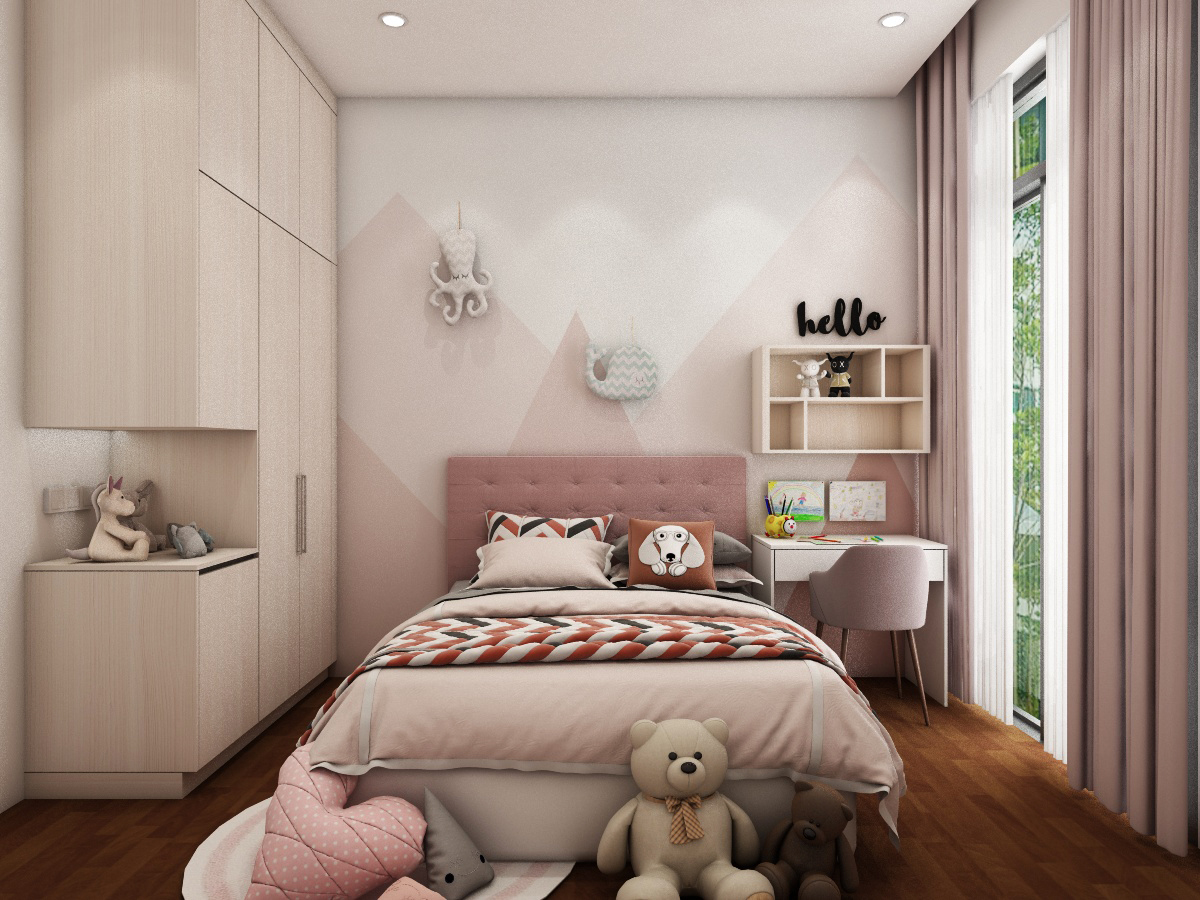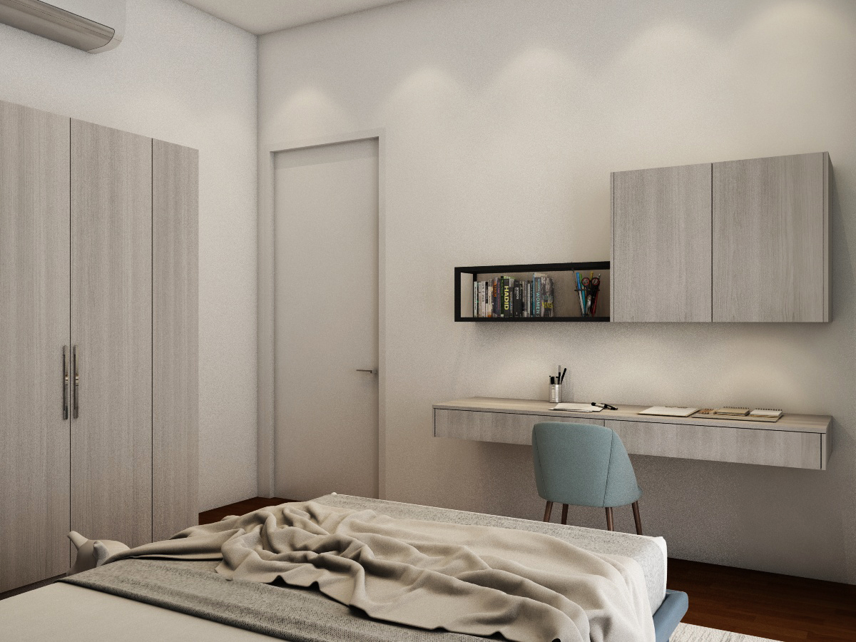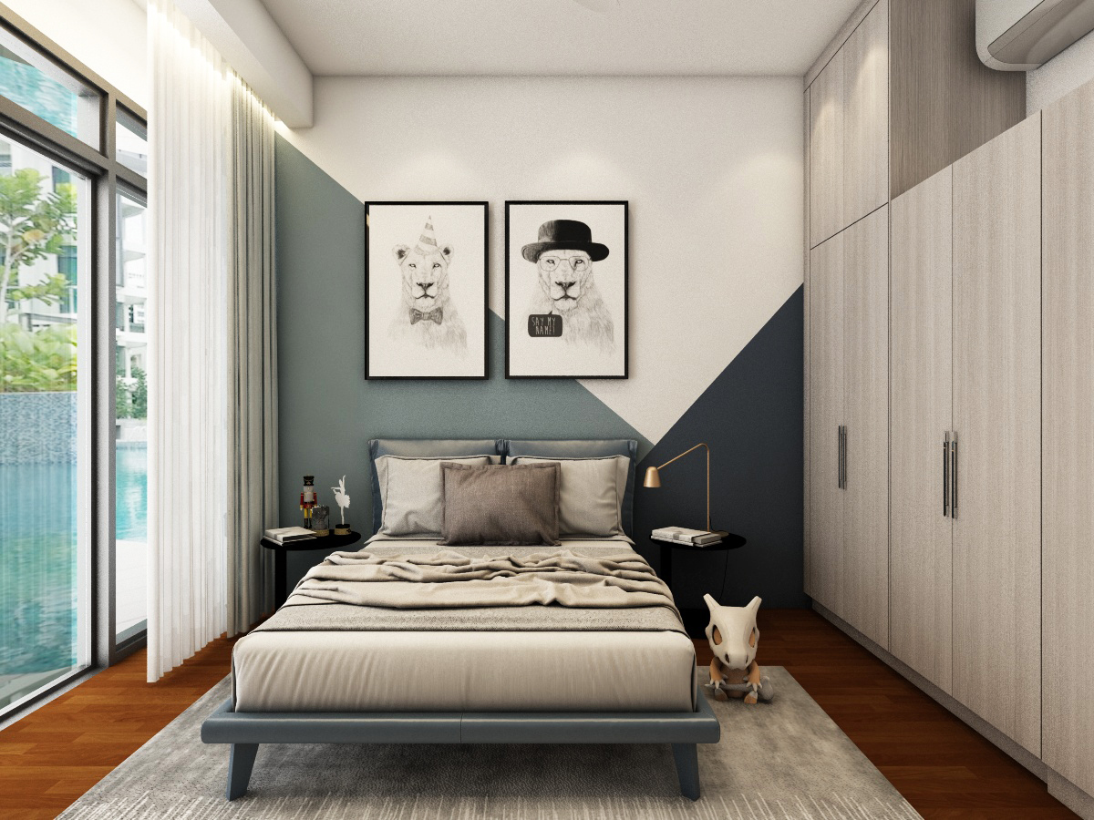 Simple, basic colors of the living room best showcase and not overwhelm the uniqueness of the location of this home, which is spacious and bright. Each bedroom is uniquely tailored to suit our client’s needs. The child’s room is designed to be cheerful, warm and young while the adults’ rooms are natural and calming.