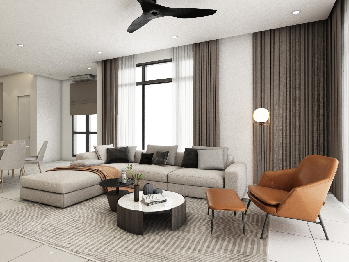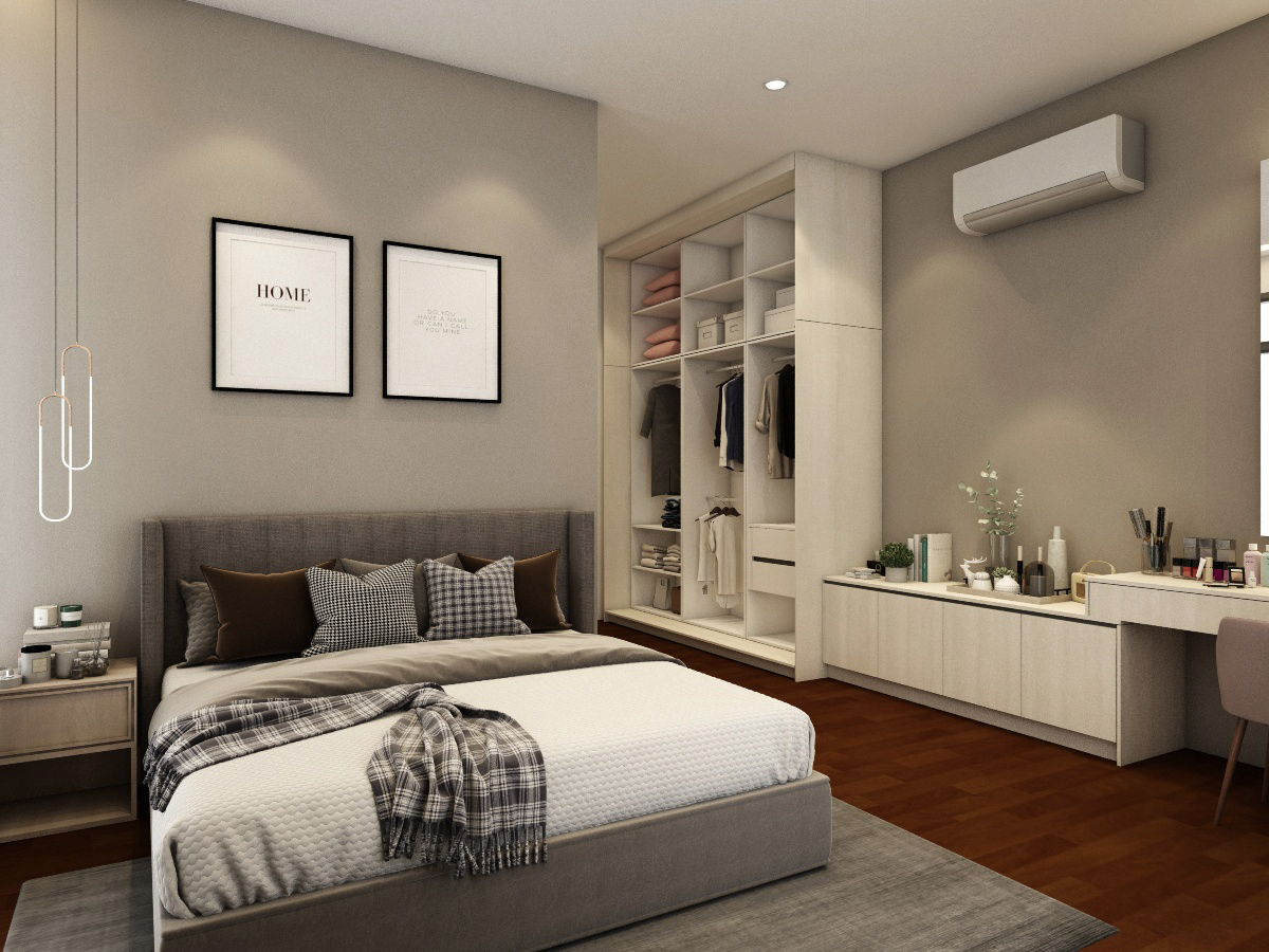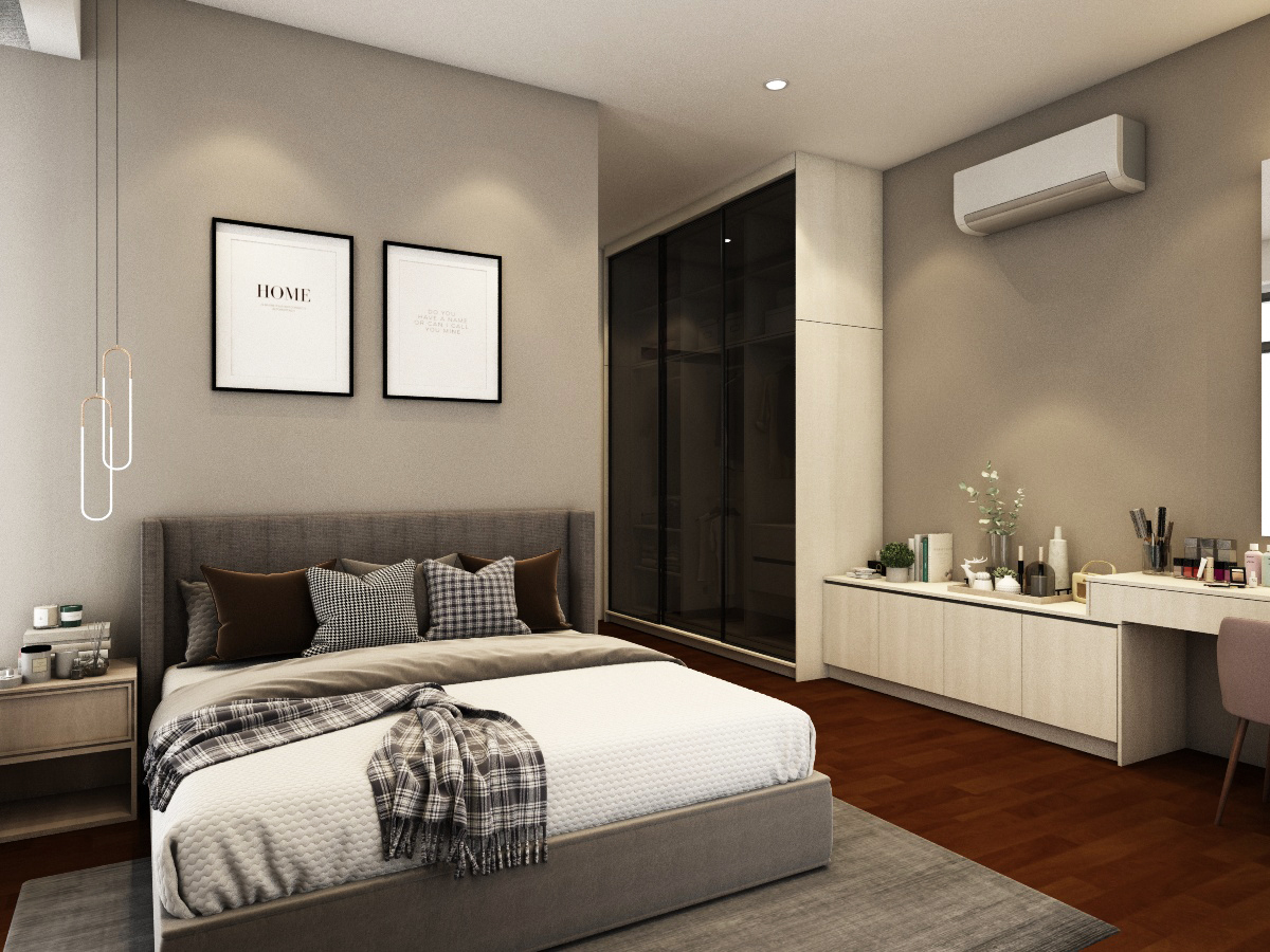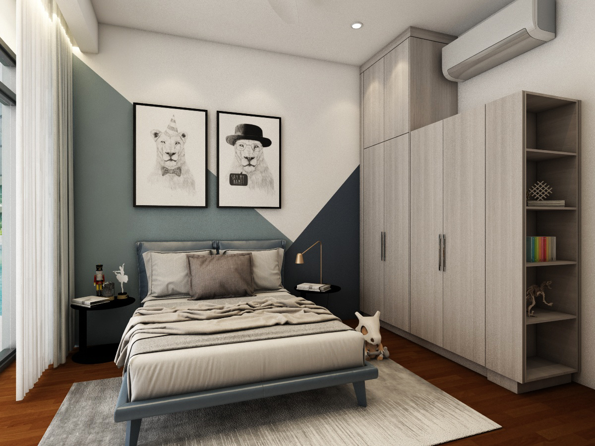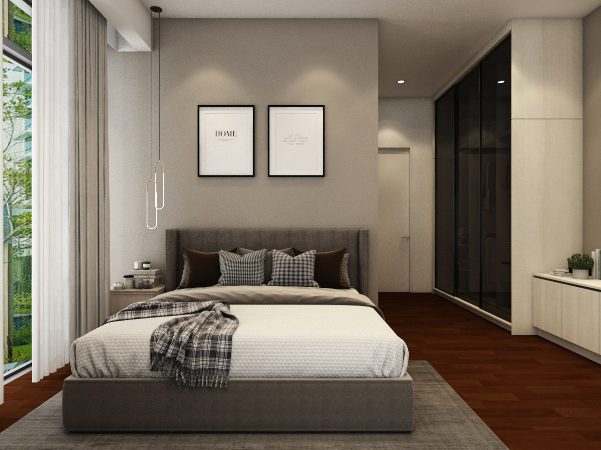 Simple, basic colors of the living room best showcase and not overwhelm the uniqueness of the location of this home, which is spacious and bright. Each bedroom is uniquely tailored to suit our client’s needs. The child’s room is designed to be cheerful, warm and young while the adults’ rooms are natural and calming.